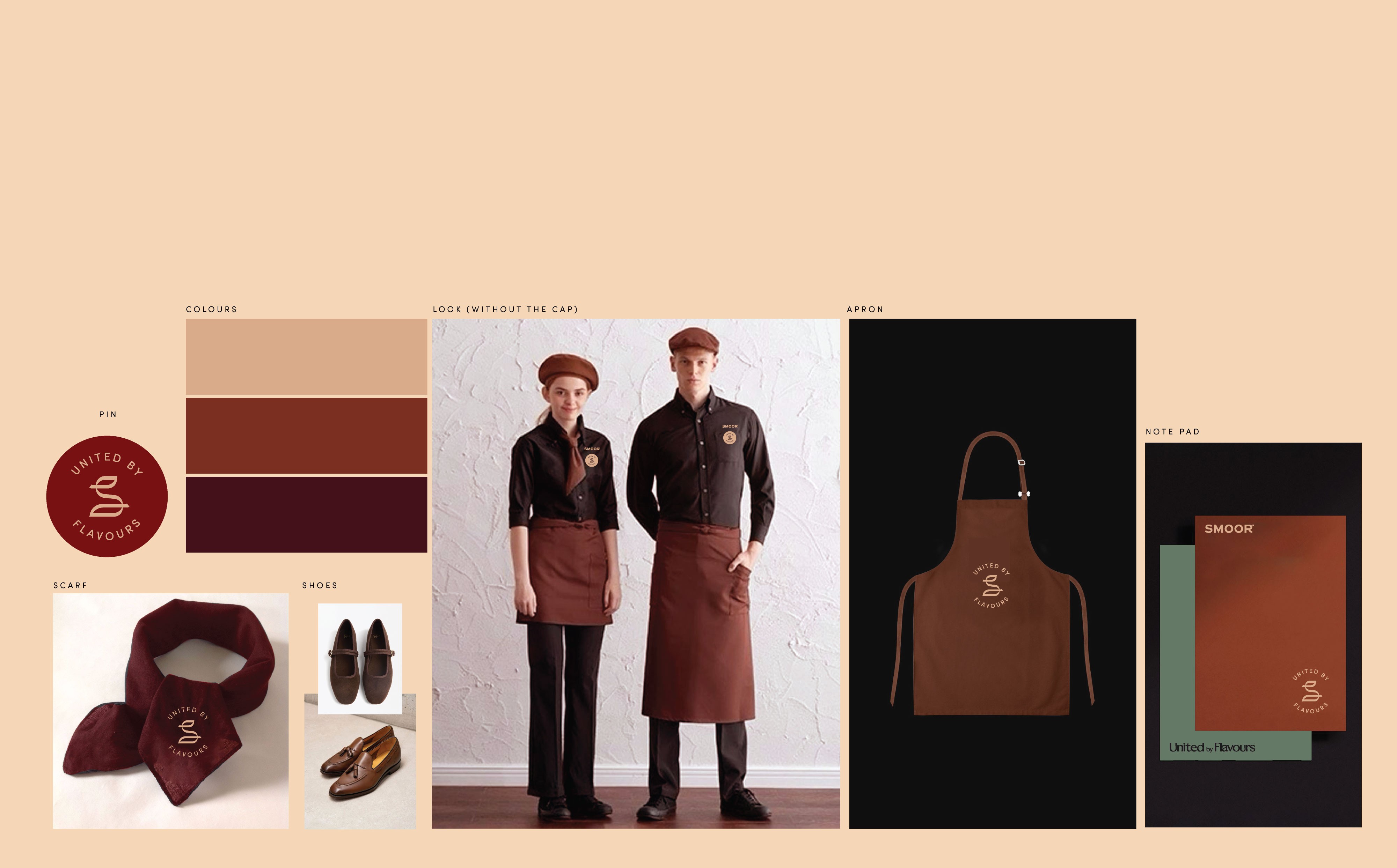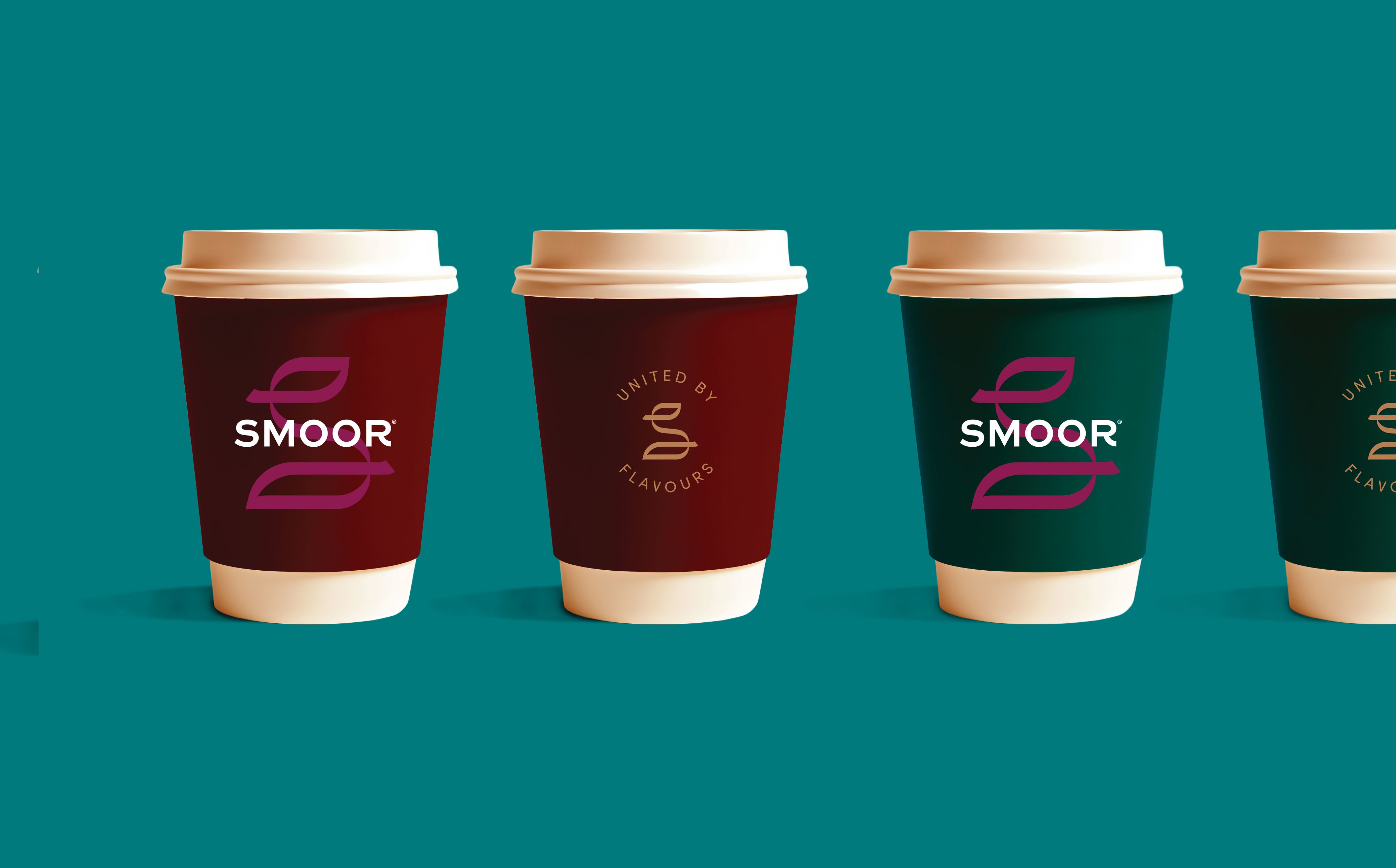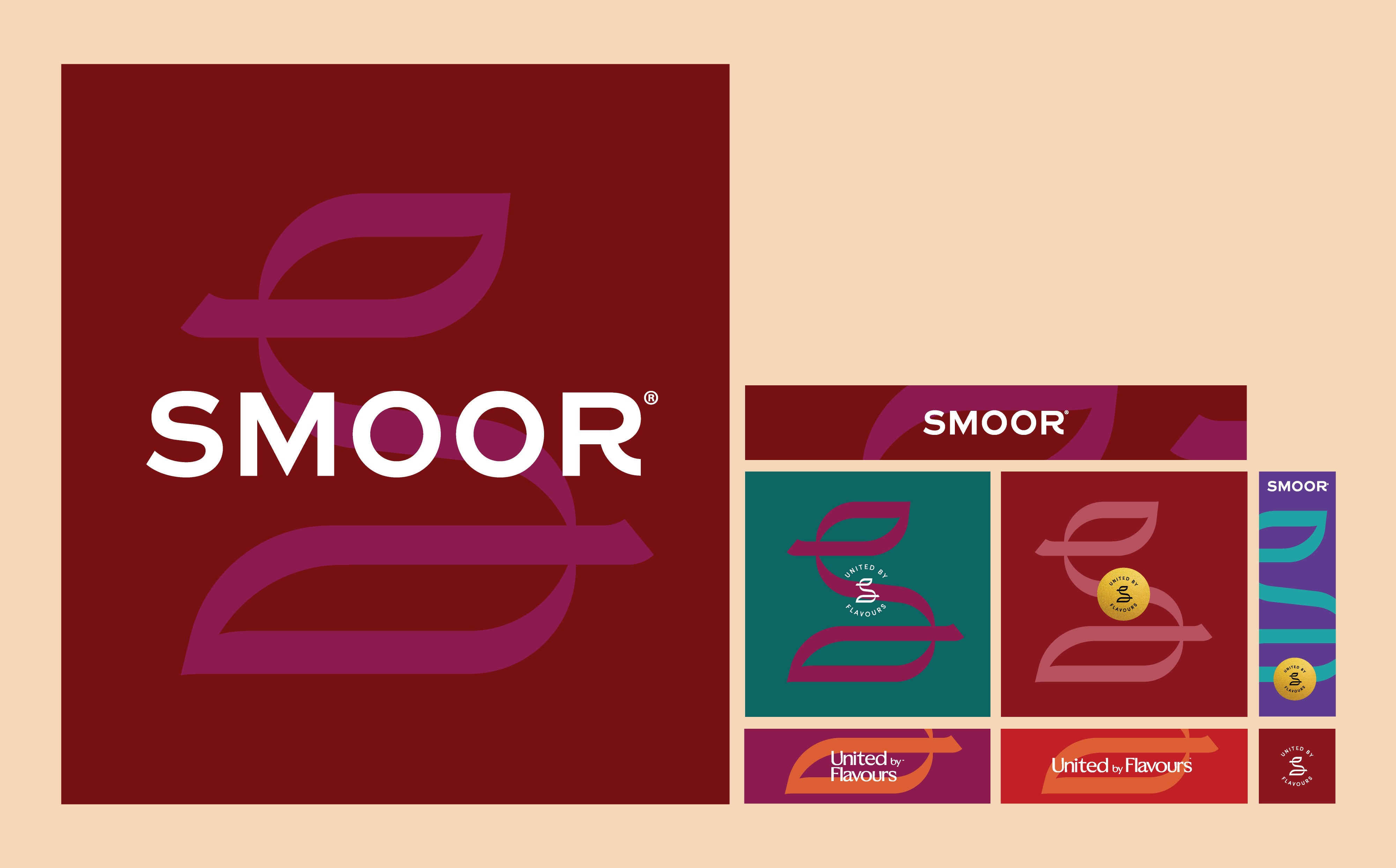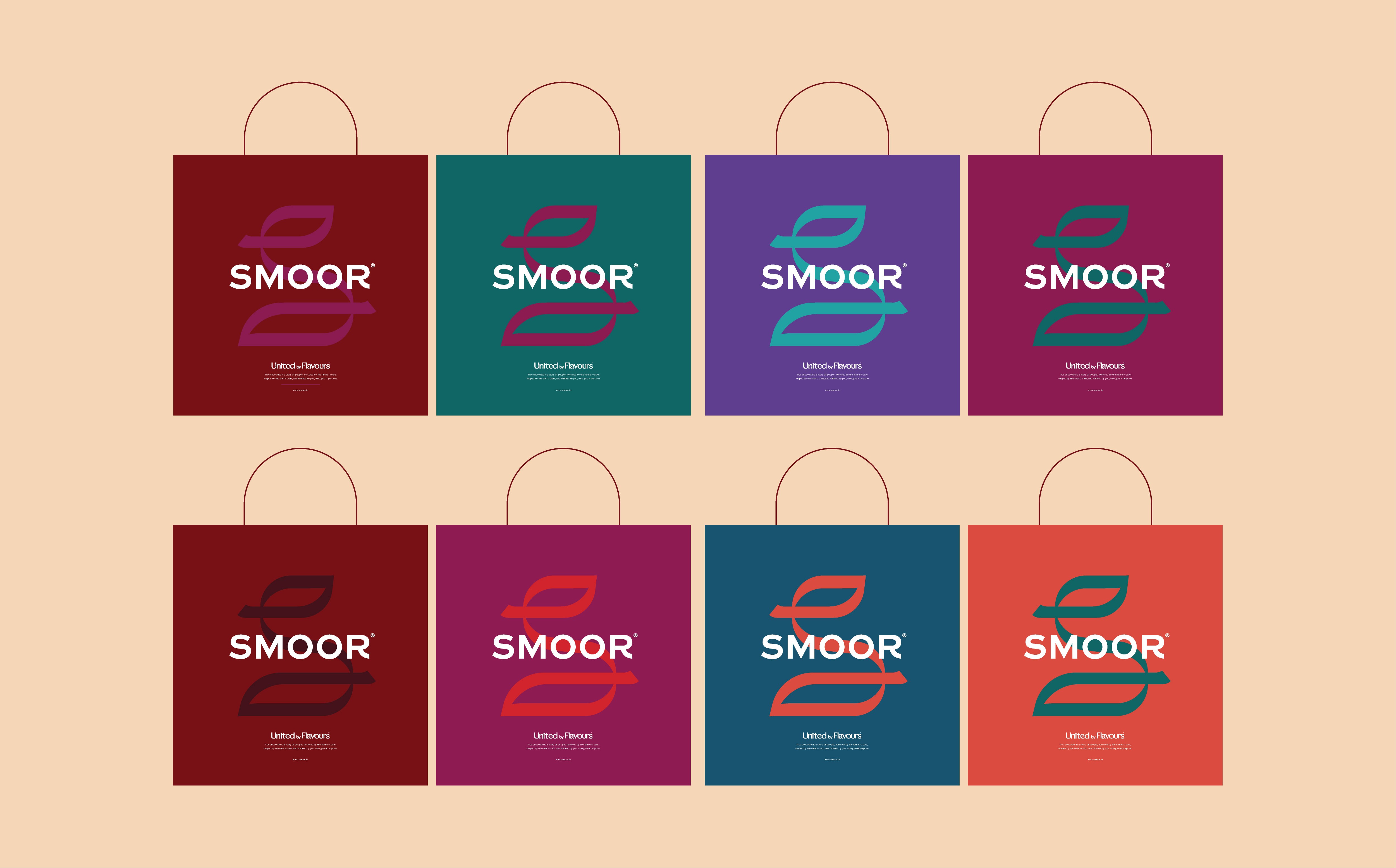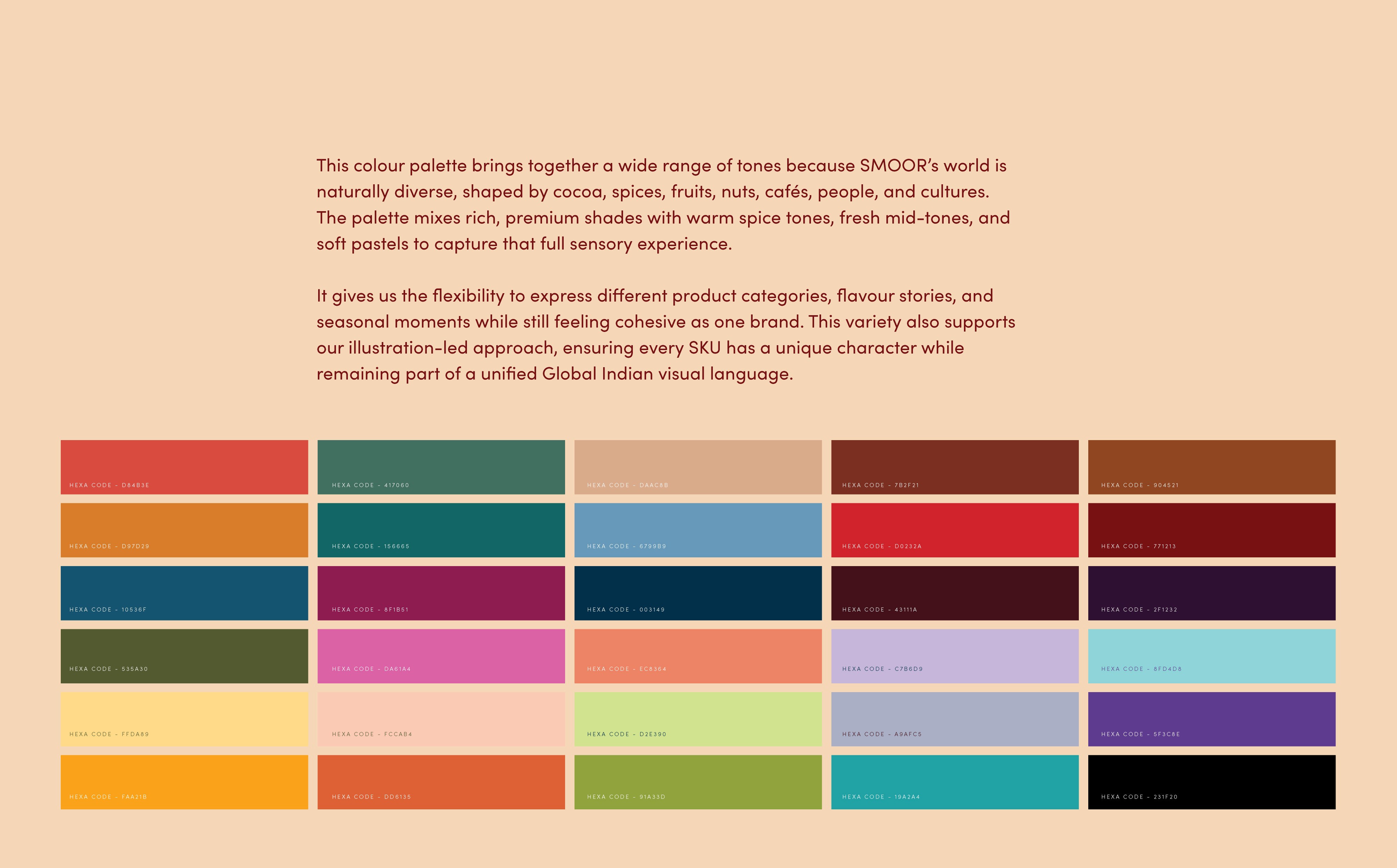 Alongside the insignia, we developed an expanded colour system for the brand. SMOOR’s world is naturally diverse, shaped by cocoa, fruits, spices, nuts, cafés, cultures, and people. The palette reflects this richness, combining premium tones with warm spice colours, fresh mid-tones, and softer pastels. This wide spectrum allows the brand to express different flavour stories and product categories while still feeling cohesive as a single visual language.