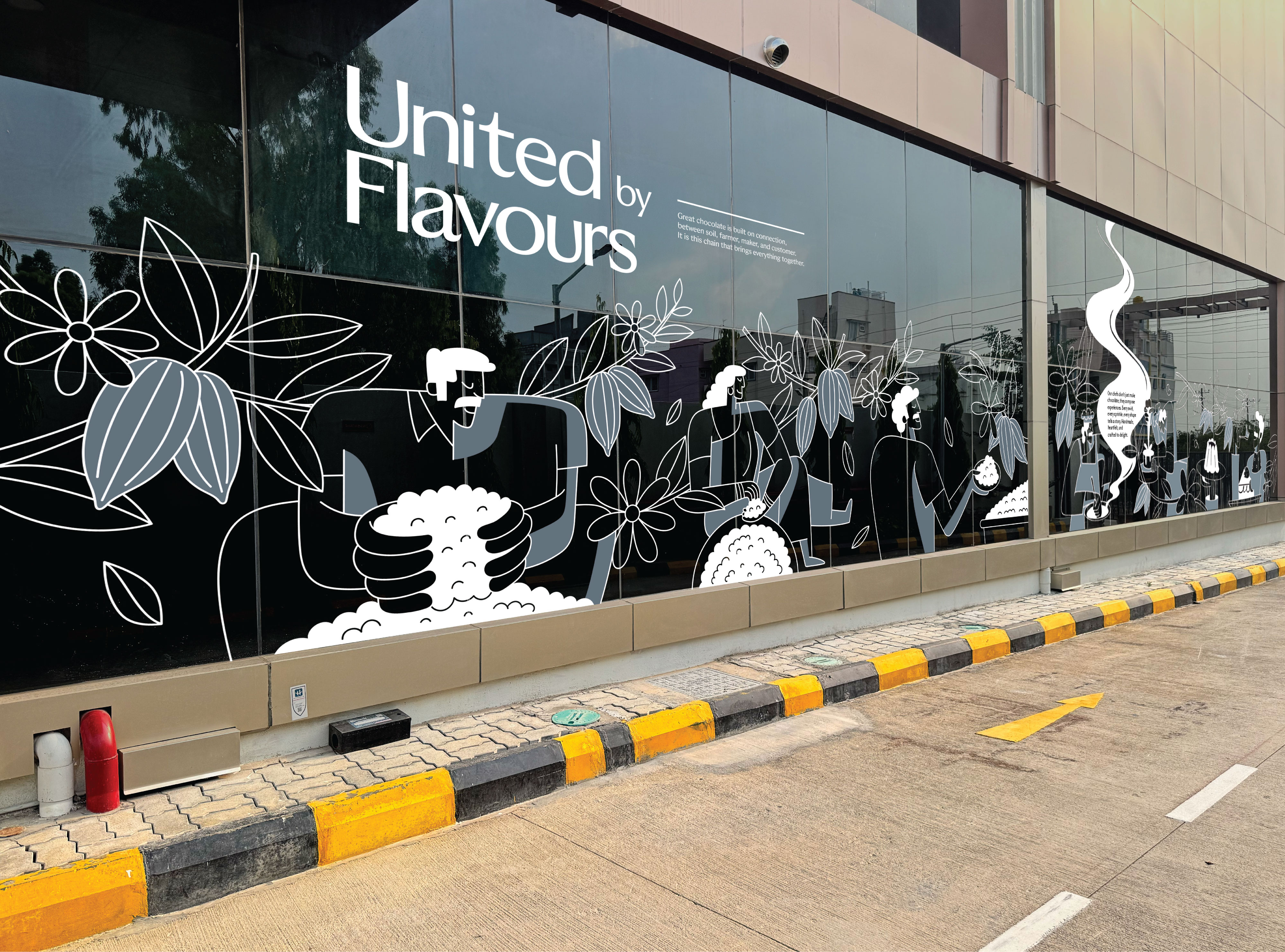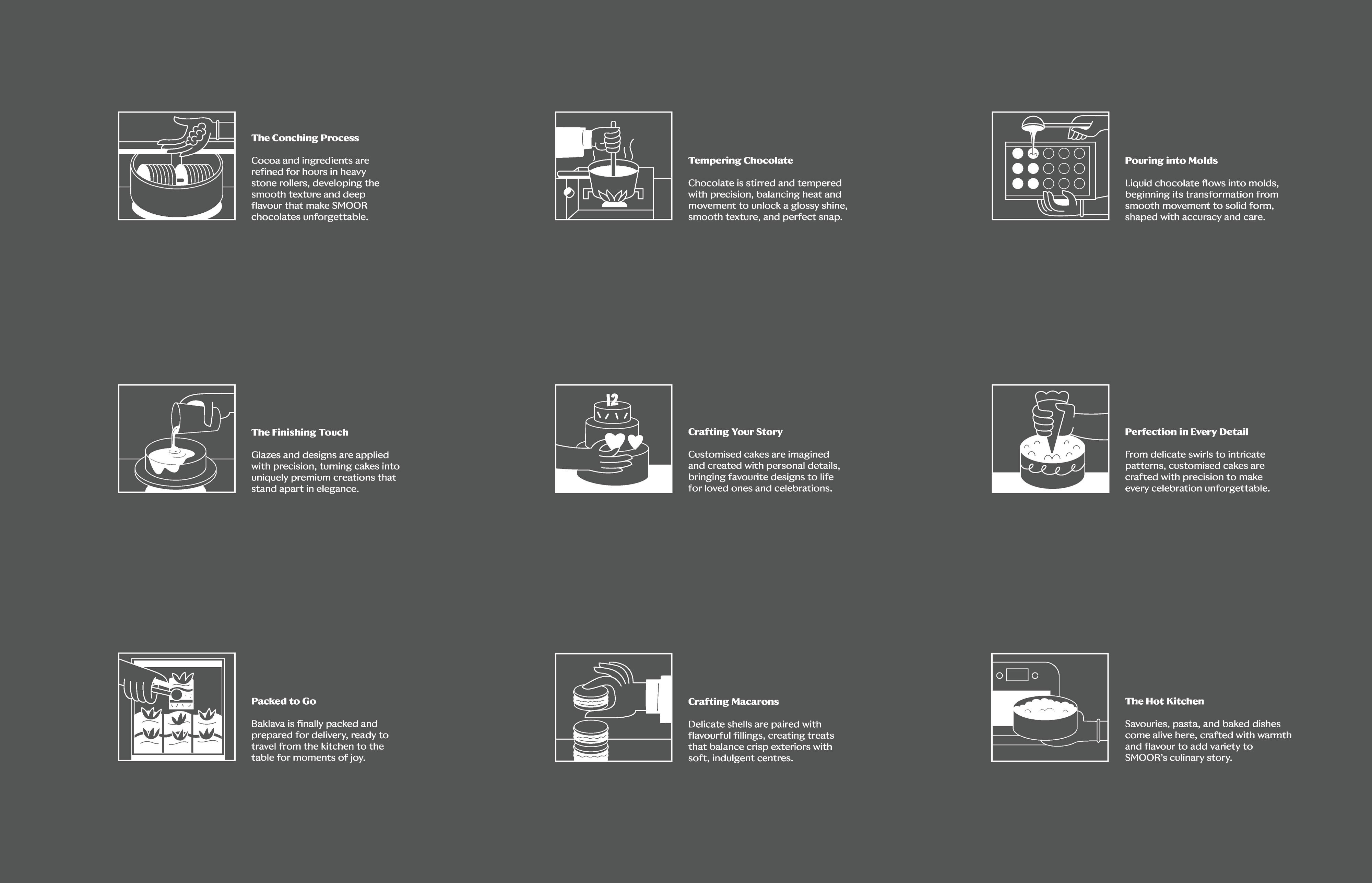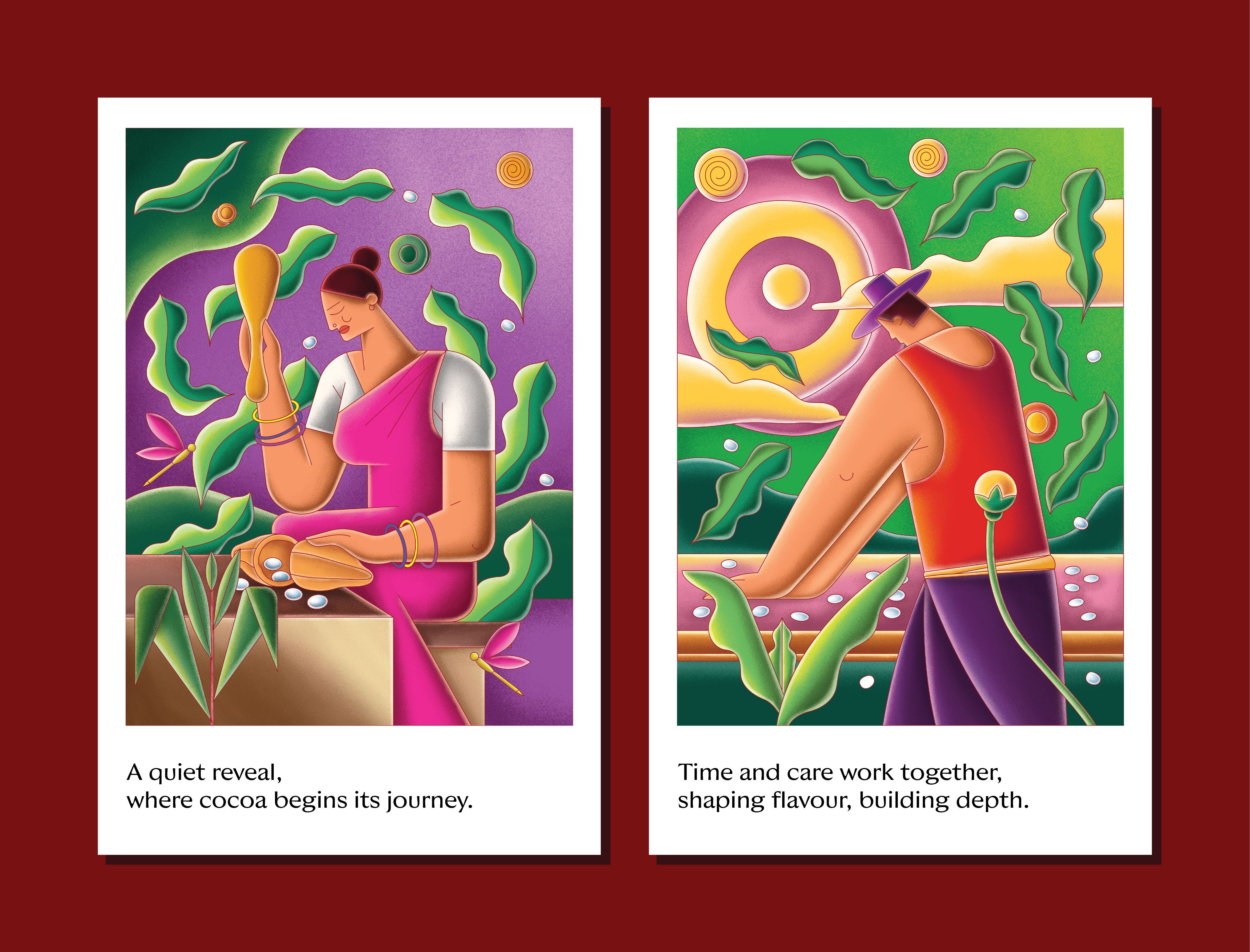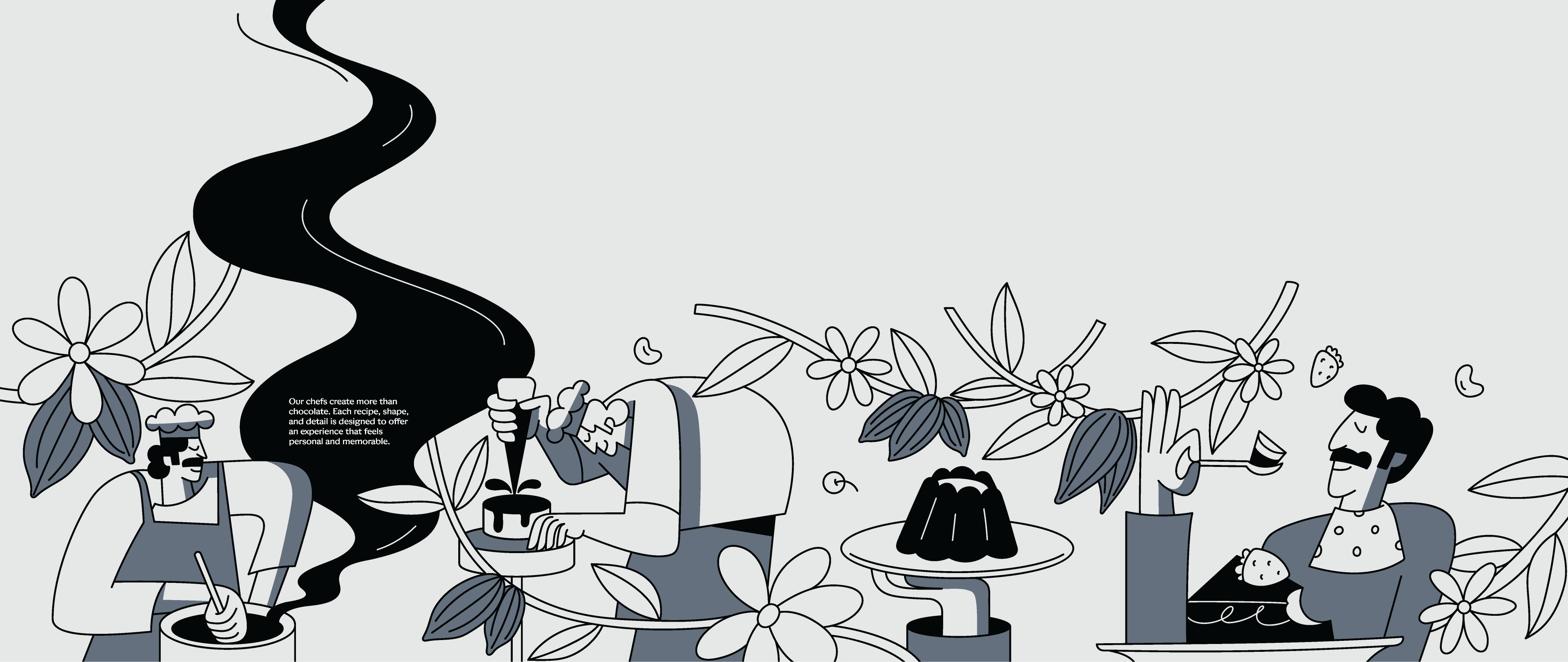 Another important decision was introducing human figures across the illustrations. For us, SMOOR’s true ingredients are not just cocoa or cream, it’s the people behind the craft. Farmers, chefs, teams, and customers all form part of the brand’s story. By bringing human presence into the visuals, the space constantly reminds visitors that chocolate is ultimately made by people, for people.