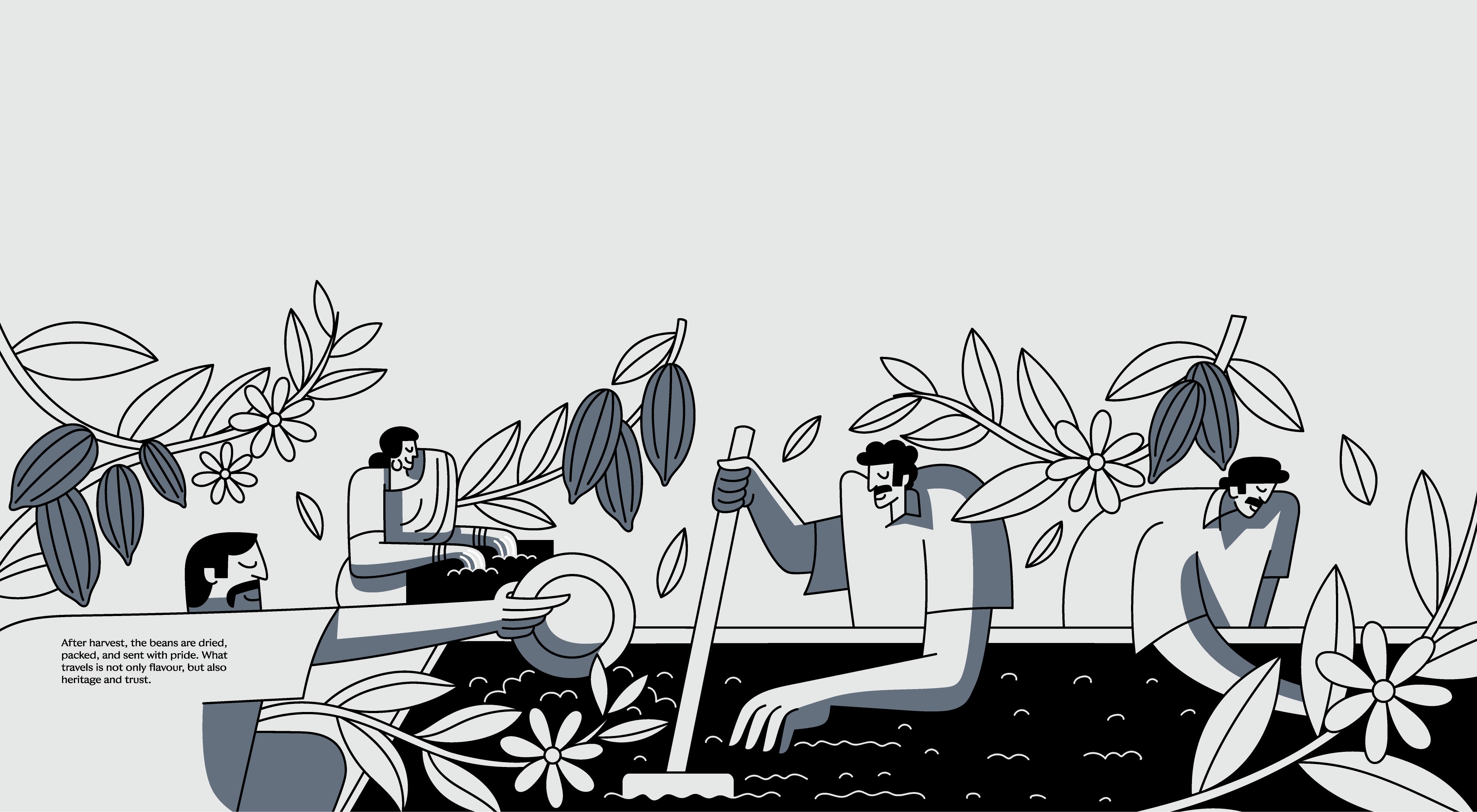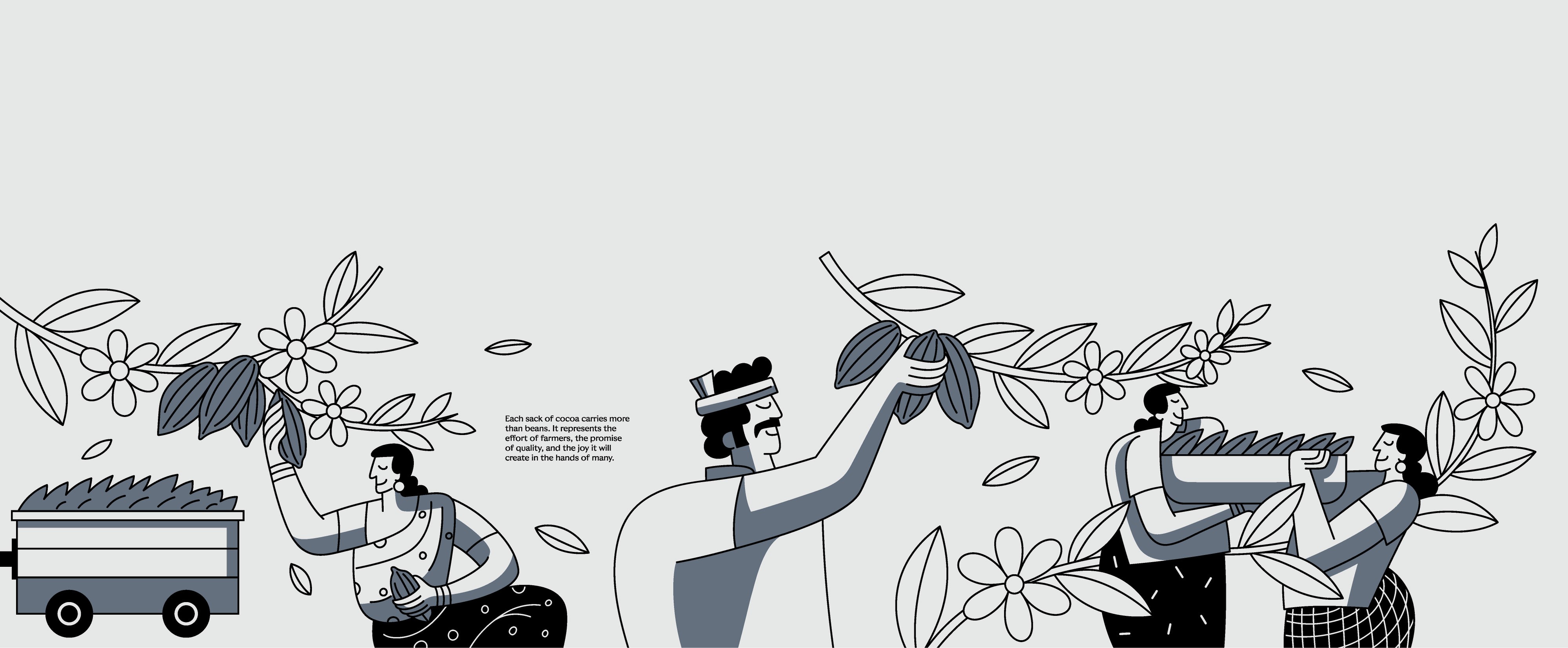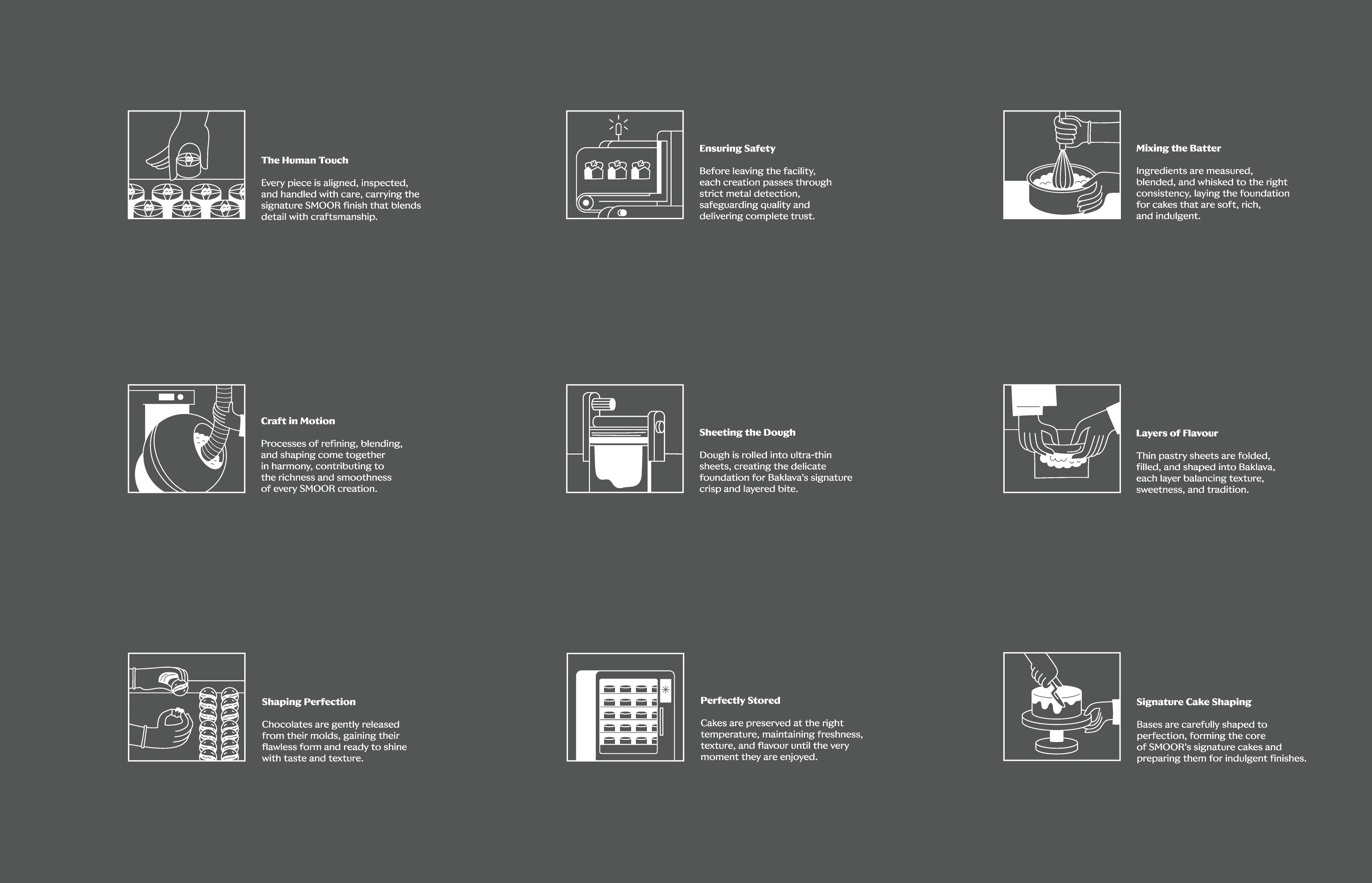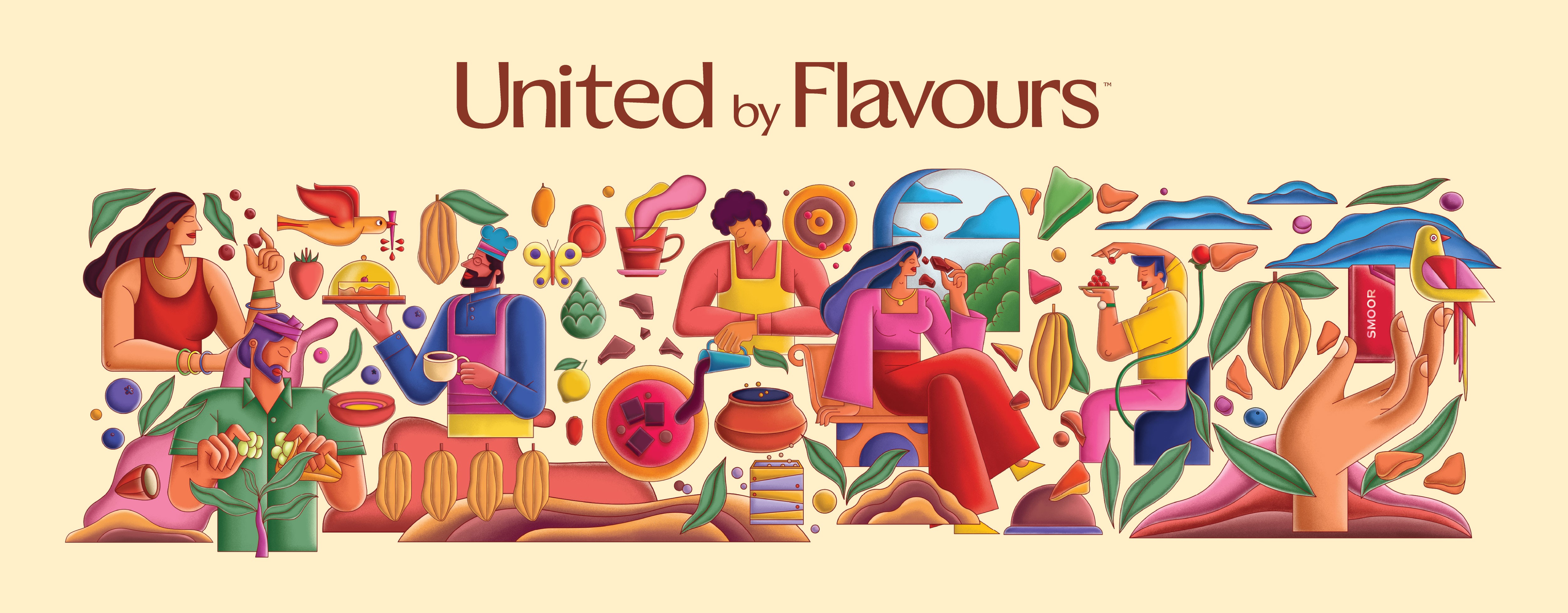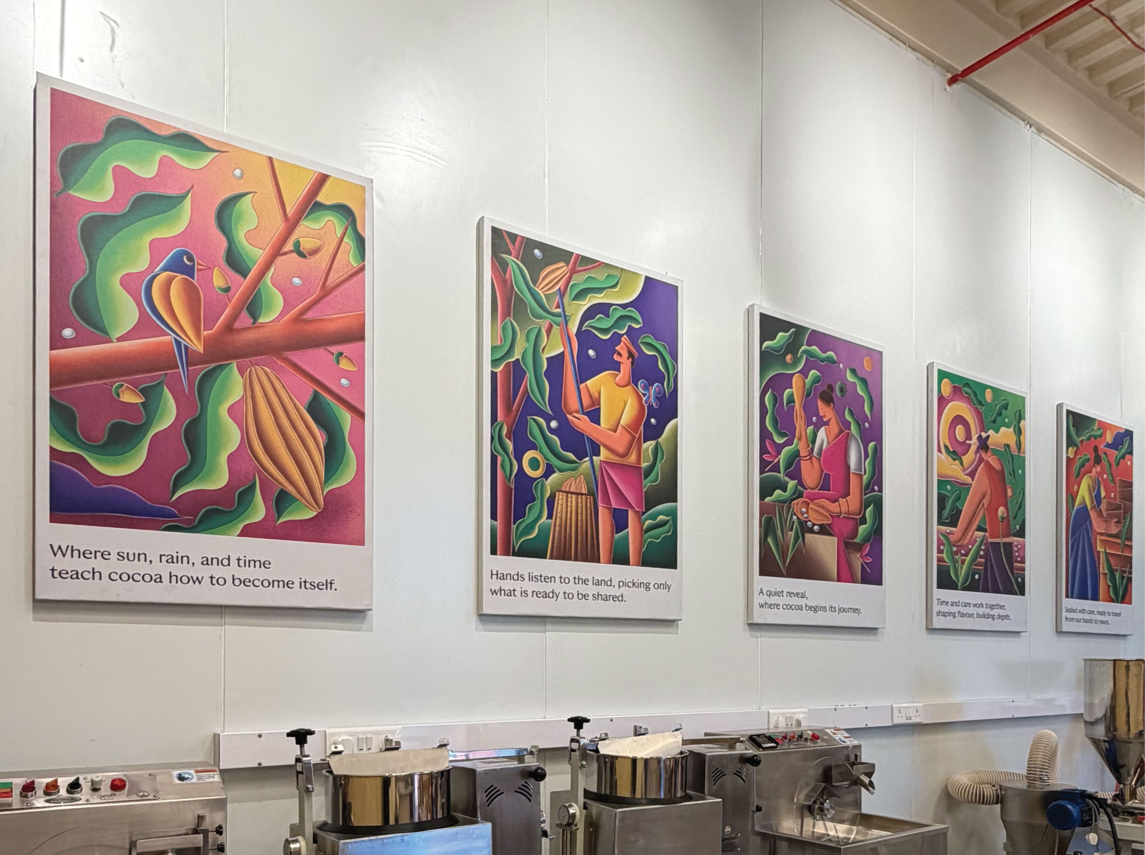 Another important decision was introducing human figures across the illustrations. For us, SMOOR’s true ingredients are not just cocoa or cream, it’s the people behind the craft. Farmers, chefs, teams, and customers all form part of the brand’s story. By bringing human presence into the visuals, the space constantly reminds visitors that chocolate is ultimately made by people, for people.