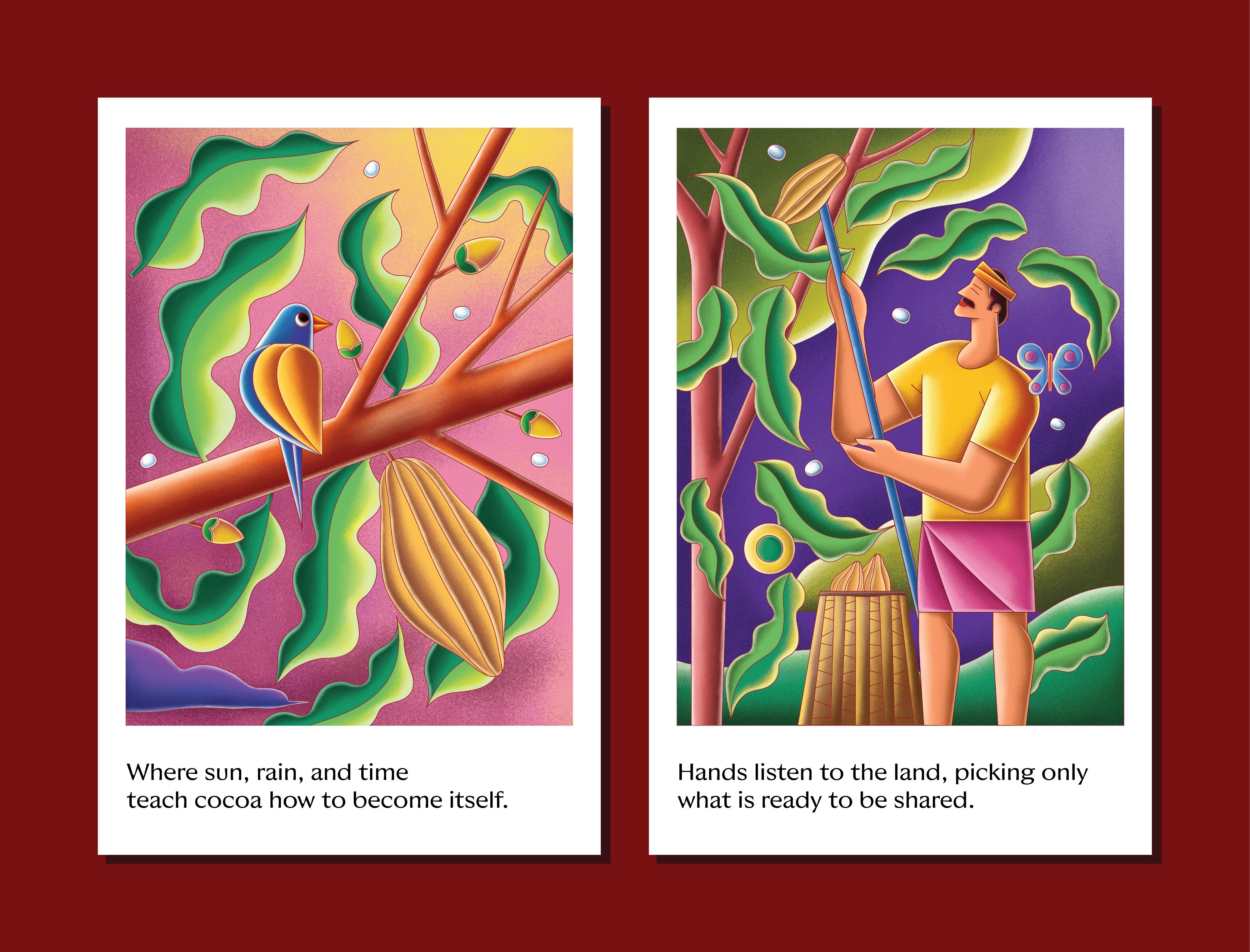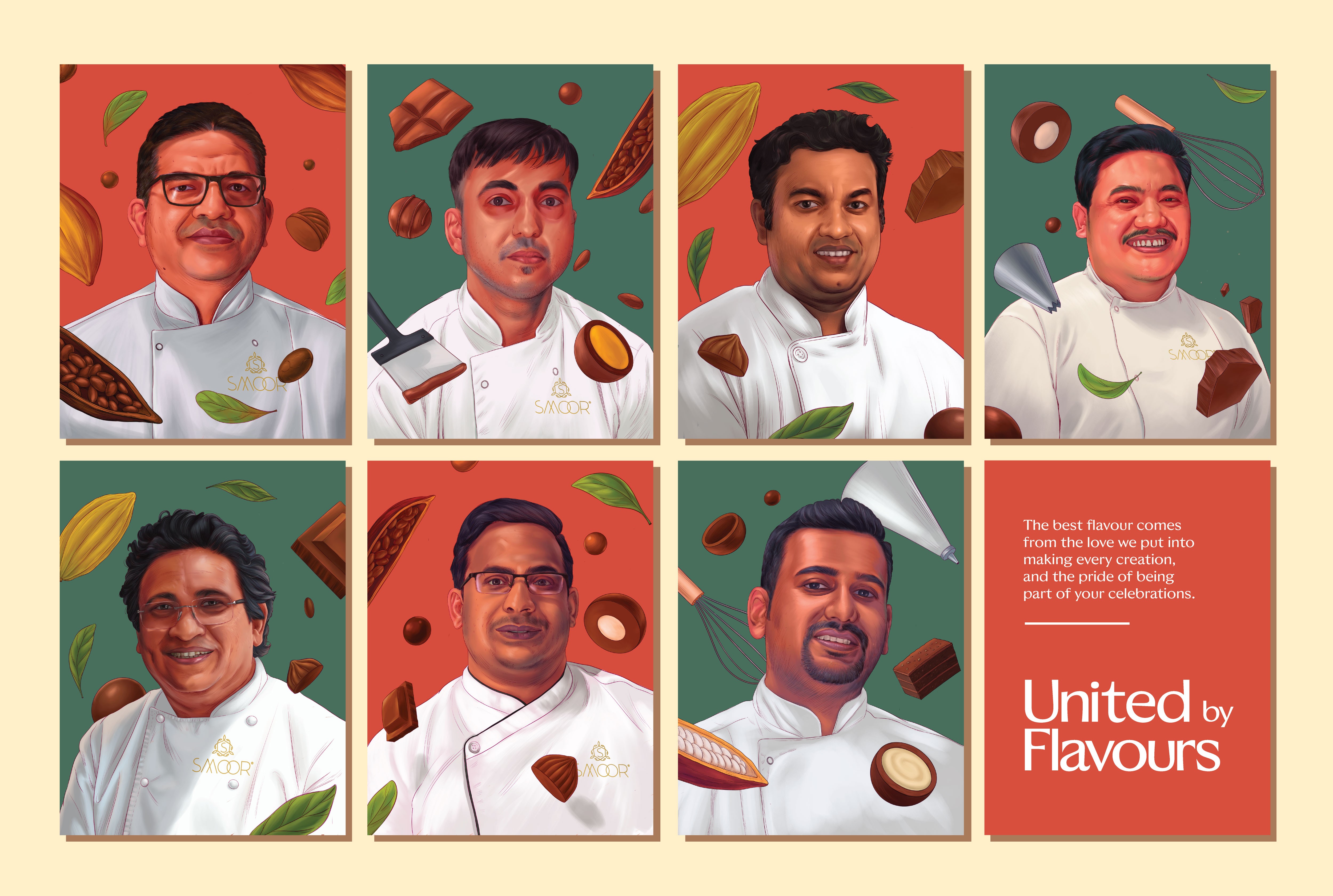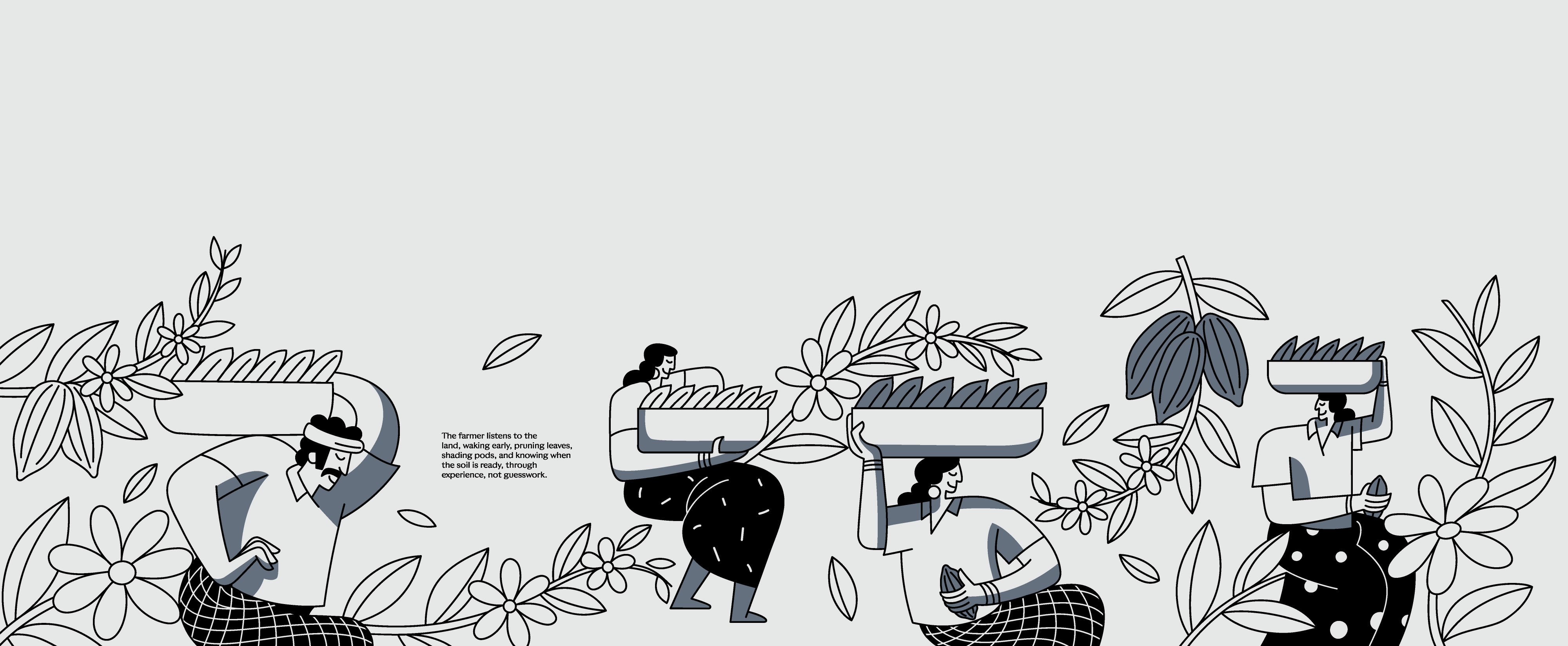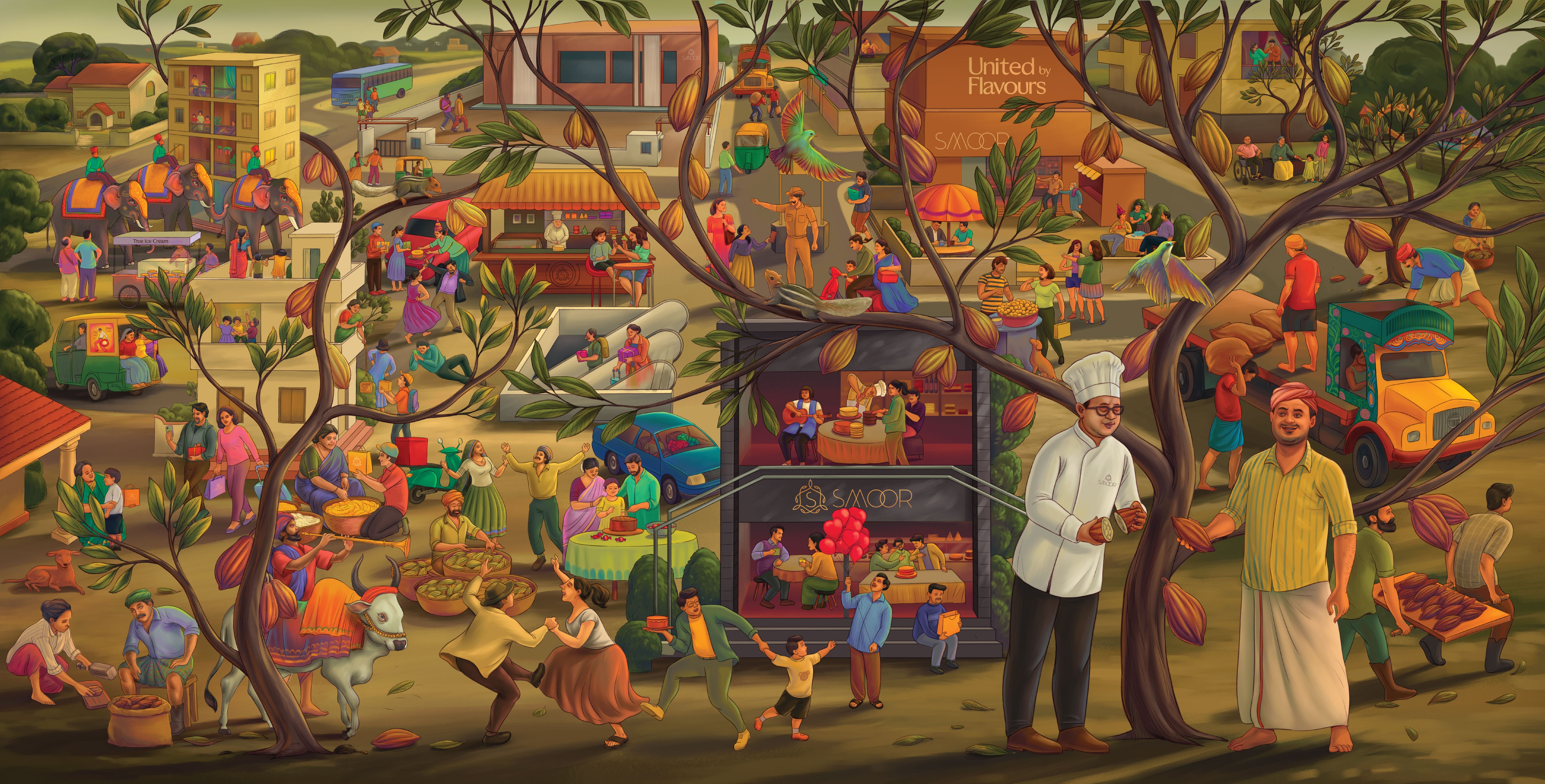Another important decision was introducing human figures across the illustrations. For us, SMOOR’s true ingredients are not just cocoa or cream, it’s the people behind the craft. Farmers, chefs, teams, and customers all form part of the brand’s story. By bringing human presence into the visuals, the space constantly reminds visitors that chocolate is ultimately made by people, for people.